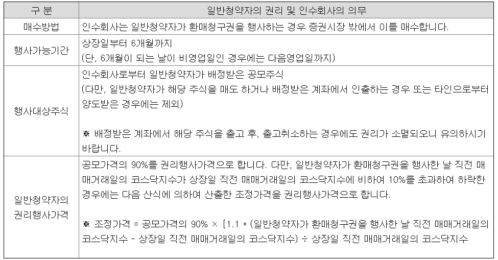 환매청구권이 포함된 청약이다. 행사가능기간은 상장일로부터 6개월까지. 공모 가격의 90%로 환매청구권을 행사할 수 있다.