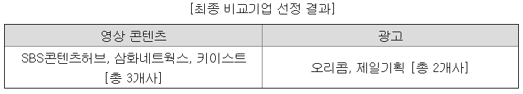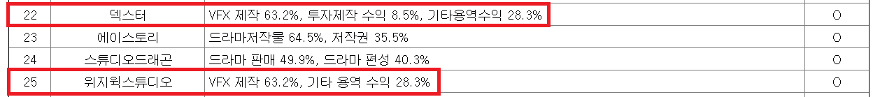 영상 콘텐츠 및 광고업으로 1차 유사회사를 산정하였다. 자이언트스텝이 영상콘텐츠 사업을 영위하는 업종이 맞긴 맞는데.. 선정된 비교기업과는 결이 다르다. 말 그대로 영상컨텐츠(드라마, 영화 등)를 제작하는 기업이지, VFX나 리얼타임 콘텐츠 기술을 가지고 있는 기업들이 아니기 때문. 마찬가지로 광고VFX 사업이 자이언트스텝의 주력사업이라는 이유로 광고회사들을 선정했는데, 역시나 자이언트스텝과는 결이 다른 회사들이다.