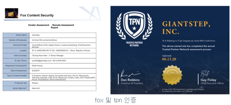 2016년 디즈니 기술품질 및 보안감사 테스트 통과 2017년 FOX content security 평가 통과 2018년 넷플릭스 4K VFX기술 테스트 통과 2019년 TPN 보안 평가 프로그램 통과 2020년 NBC Universal 정식 벤더 등록 |