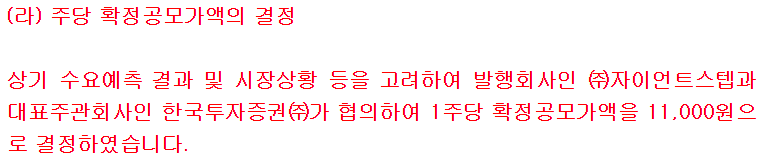 공모가 상단인 11,000원을 고수하였다. 사실 공모가 상단 대비 할인율 자체가 22% 정도밖에 되지 않았기 때문에, 공모가를 올렸다간 메리트가 많이 줄어들 수도 있었는데 매우 잘한 선택으로 보인다. (같은 날 상장하는 제노코는 공모가를 올리고도 할인율이 27.37%이다.)