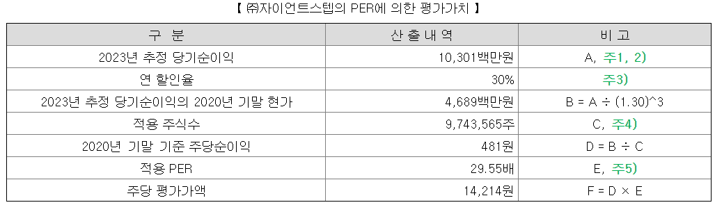 다소 높게는 보였던 2023년 추정 당기순이익을 이용하였고, 그래도 꽤 높은 연 할인율 30%를 적용하여 4,689백만원으로 당기순이익을 정하였다. 2021년 추정 당기순이익 4,156백만원에 비하면 12% 더 높다. 여기에 적용 PER 29.55배를 적용하여 주당 평가가액 14,214원을 산출하였다.