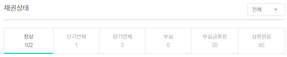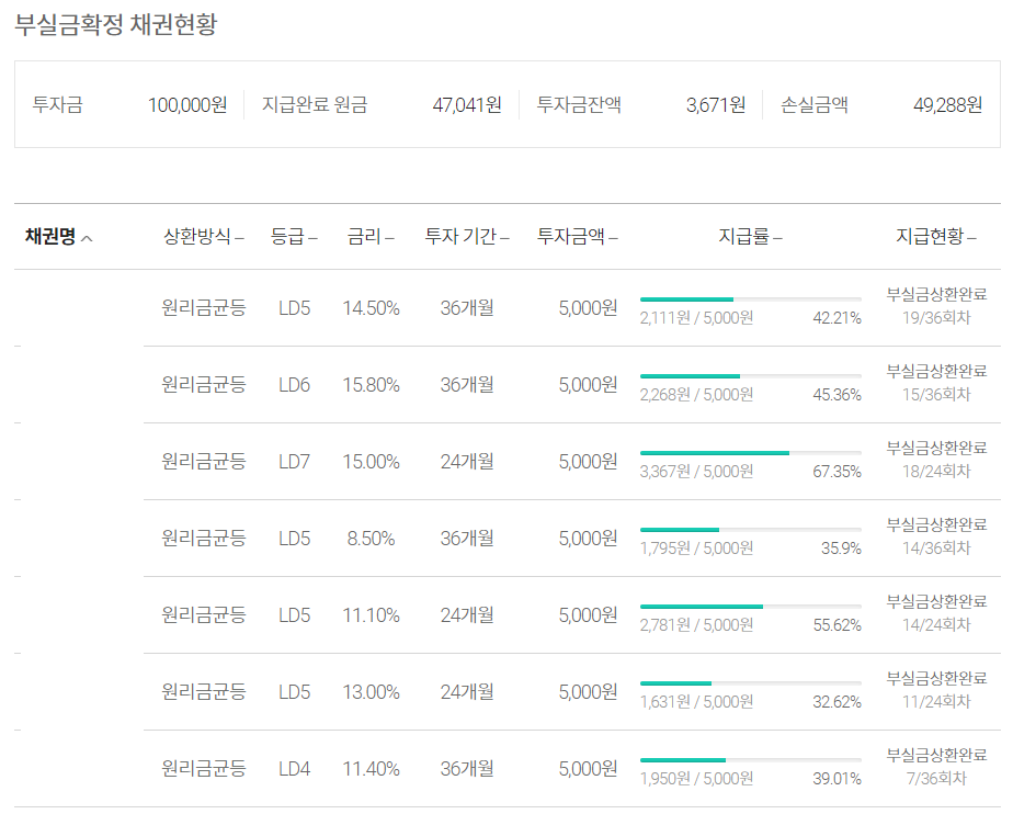혹시 몰라서 채권명은 가린다. 실제 손실 금액은 49,288원 정도. 손실로 따지면 5%이다. 다만 아직 연체 건도 있고, 정상 건도 언제 연체로 돌아설지 모르기 때문에 누적 손실액은 계속 늘어나는 셈. (손실이 1도 없을 수는 없고, 분산투자를 통해 손실을 이자로 메꾼다는 게 애초에 렌딧의 목표)