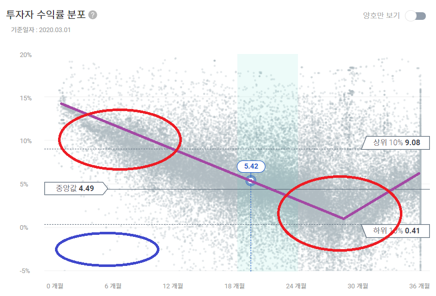 1. 파란색 원을 보면 초기에는 수익률 낮은 0% 이하가 거의 없는 것을 알 수 있다. 이 정도 기간에는 연체가 많이 발생하지는 않는 셈.