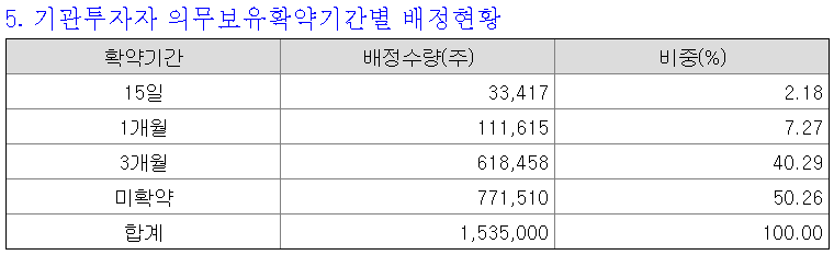 실제 기관투자자 의무보유 배정은 기관투자자 배정물량 약 153만주 중 763,490주가 의무보유확약으로 묶이게 되었다. 미확약이 50.26%로, 배정된 의무보유확약비율은 49.74%이다.