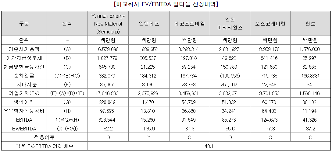 6개 회사의 EV/EBITDA 산출 결과 멀티플이 과도하게 높은 엘앤에프는 제외하고, 5개 회사 평균 EV/EBITDA 48.1배로 산출하였다.