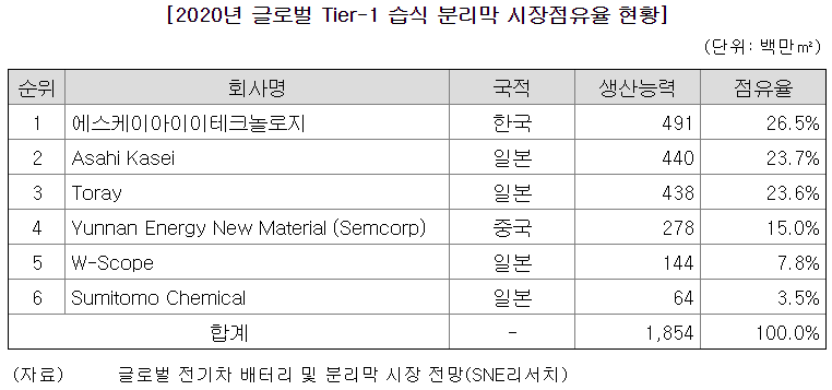 그러나 분리막 제조사 중 글로벌 주요 완성차 업체에 납품되는 Top-tier 배터리 부품 요구 수준에 부합하는 기술 및 생산능력을 보유한 기업을 Tier-1으로 분류하며, 이러한 Tier-1 업체들 간 분리막 시장 점유율로 봤을 때는 SK IET가 글로벌 1위라고 한다.