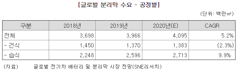 2020년 말 기준 글로벌 시장에서 건식은 33.8%, 습식은 66.2% 정도의 점유율을 기록 중이다. 배터리 시장은 점점 소형화, 경량화, 고용량화 되고 있으므로, 습식 분리막의 절대적 규모 및 비중은 점차 증가할 것으로 예상된다.