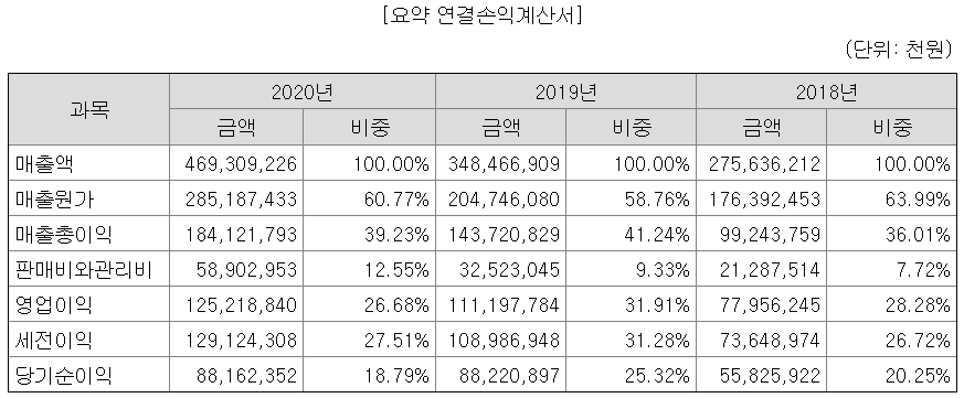 매출액 증가에 따라 영업이익과 당기순이익 또한 꾸준하게 상승 중이다. 다만 2020년의 경우 매출액은 상승했으나, 영업이익률과 순이익률이 많이 떨어진 것을 확인할 수 있다. SK IET는 분리막뿐만 아니라 2020년 7월 플렉서블 디스플레이 패널을 보호하는 용도로 사용하는 소재인 FCW(Flexible Cover Window) 판매를 개시하였는데, FCW 관련 매출이 본격적으로 발생하기 전 마케팅비, 물류비, 생산설비 감가상각비 등이 반영되었기 때문이라고 한다. 또한 중국 창저우 공장이 생산을 개시하기 전 대규모 설비투자 및 감가상각비가 발생했다고 SK IET측은 설명하였다.