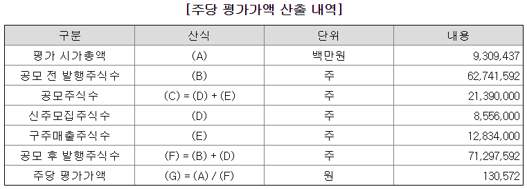공모 후 발행주식수를 계산하여 주당 평가가액 130,572원을 산출하였다.