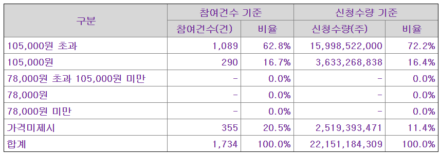 밴드 상단인 105,000원 미만을 제시한 기관은 단 한 곳도 없었다. 밴드 상단에 16.4%, 밴드 초과 및 가격미제시가 83.6%였다.