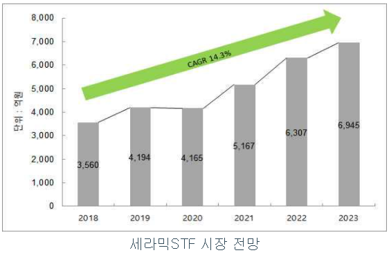 DRAM과 NAND검사는 대면적 MEMS 프로브카드를 사용하여 반드시 세라믹 STF를 사용해야 한다. 또한 반도체의 미세화, 고집적화에 따라 프로브카드도 점차 고집적화되어 세라믹STF시장의 비중이 점차 확대될 것으로 전망된다고 한다. 따라서 전세계 세라믹STF 시장의 연평균 성장률은 13.2% 수준으로 전망된다.