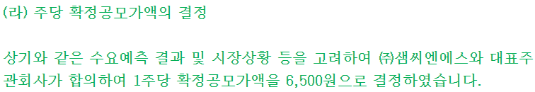 뜬금없이 공모가는 6,500원으로 결정되었다. 6,500원 이상 신청 비율이라도 공개했으면 모르겠는데, 왜 갑자기 뜬금없이 올린 것인지 모르겠다. 이럴 거면 공모가 산정 당시 할인율을 적게 책정하던가 하지.. 일단 수요예측 결과는 높게 받고, 실제 공모가는 올려버리는 양H같은 행태가 아닌가.. 매우 아쉬운 결과이다.