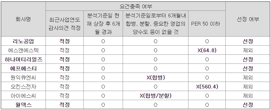 유사기업으로 리노공업, 하나머티리얼즈, 에프에스티, 월덱스를 선정하였다.