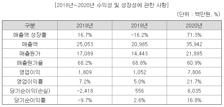 매출액, 영업이익, 당기순이익 꾸준히 증가하고 있으며, 2020년 영업이익률과 당기순이익률이 크게 개선되었다. 업종 특성상 가동률이 높아질수록 수익성이 개선되는데, 2020년 69%의 가동률을 기록하였다. 가동률이 더 높아지면 더 개선될 여지가 있다.