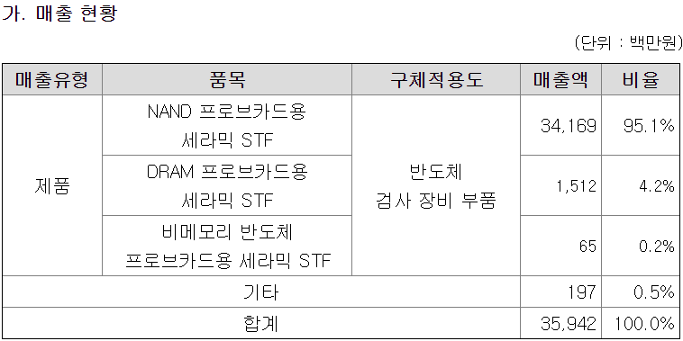 현재 매출의 대부분은 NAND 프로브카드용 세라믹 STF에서 나온다. DRAM 프로브카드용 세라믹 STF의 경우 2019년 일본 수출 규제 영향으로 국산화가 진행되고 있으며, 샘씨엔에스는 2020년 삼성전자에 공급되는 DRAM 프로브카드에 제품 사용 승인을 획득했다.