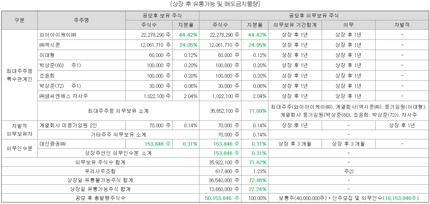 공모가를 갑자기 확 올린 게 너무 아쉽지만.. 그 외에 다른 조건은 매우 좋다. 반도체 제조공정 상 테스트 부품 업체로 굉장히 핫한 테마이며, 기술력 또한 굉장히 우수한 업체이다. 유통가능물량도 의무보유 확약 반영 시 나쁘지 않은 수준. 청약은 물론 할 예정인데, 얼마나 배정받을 수 있을지가 관건인 듯하다.