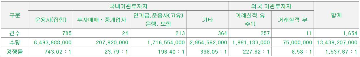 샘씨엔에스 기관 수요예측 결과 최종 경쟁률 1537.67을 기록하였다. 최근 공모주들에 비해 확실히 이견이 없는 높은 경쟁률이다.