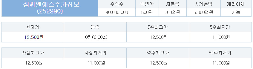현재 38커뮤니케이션에서 거래되는 샘씨엔에스 장외가는 12,500원이다. 4월 28일 거래되었으며, 현재 매수호가는 11,000원, 매도호가는 14,000원이다. 장외가 12,500원은 공모가 대비 92% 정도 상승한 가격이다.