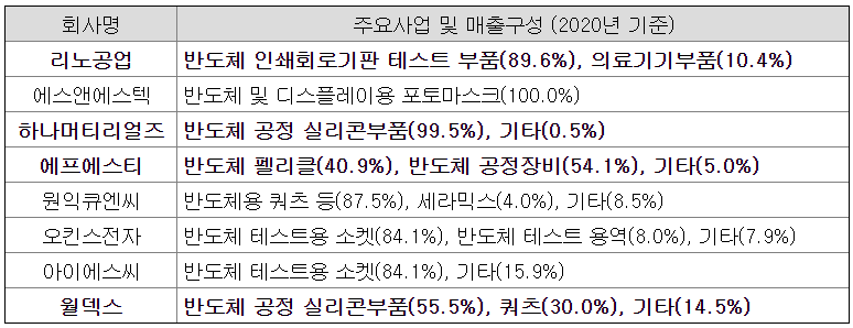 4개 기업 모두 반도체 제조공정 부품 사업을 영위하고 있다. 어차피 국내에 샘씨엔에스와 완전히 유사한 기업은 없으므로, 유사기업 선정은 적절한 것으로 보인다.