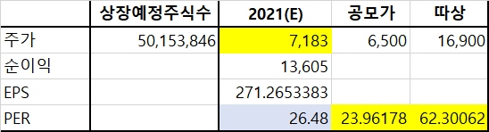 2021년 추정 순이익을 할인율 적용하지 않고 그대로 계산해 보았다. PER 26.48을 그대로 적용 시 7,183원이다. 공모가 기준 PER은 23.9배, 따상 시 PER은 62.3배 정도이다. 공모가를 한참 올렸지만 유사기업 선정과정이 크게 무리 없어 보이고, 할인율도 어느 정도 적용했으므로 크게 무리는 없어 보인다.