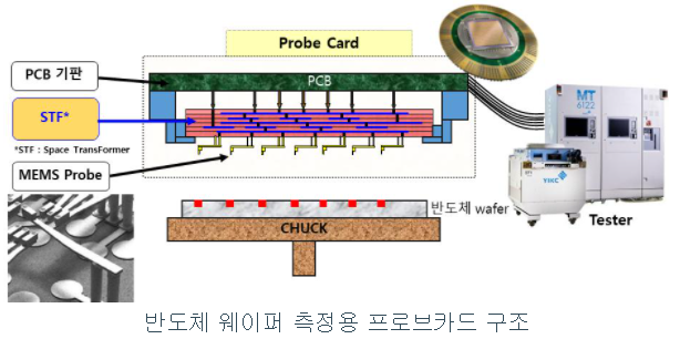 프로브카드에 장착된 프로브 핀이 웨이퍼에 접촉하면서 전기적 신호를 보내고, 돌아오는 신호에 따라 불량 반도체 칩을 판별하게 된다. 세라믹 STF는 프로브카드의 뇌에 해당하는 부품으로 웨이퍼 상의 수십 ㎛의 측정 패드를 테스터까지 연결하는 역할을 한다.