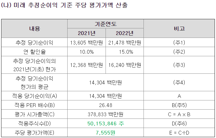 2021년 당기순이익과 2022년 당기순이익에 각각 10%, 15%의 연 할인율을 적용하여 추정 당기순이익을 계산한 다음, 산술 평균하여 주당 평가가액을 산출하였다. 주당 평가가액은 7,555원이다.