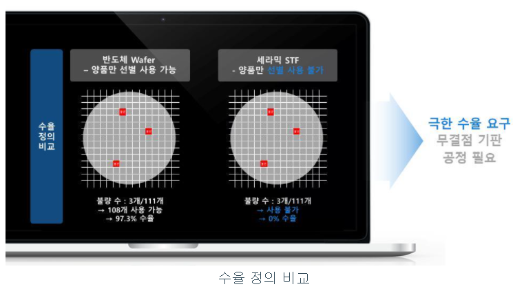 세라믹STF는 반도체 웨이퍼랑은 다르게 단 한 개의 불량만 있어도 사용이 불가하므로 무결점 기판만 사용이 가능하다. 따라서 세라믹 STF의 생산공정은 극한의 수율이 요구되는 공정이다.