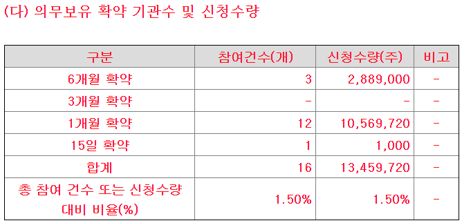의무보유 확약 비율은 1.5%.. 최근에 본 적 없는 수치이다. 의무보유 확약은 거의 없다고 봐도 좋을 듯.