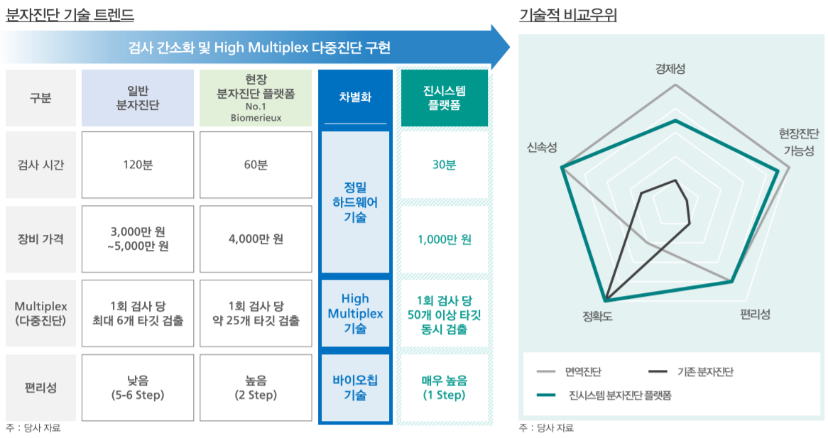 진시스템의 핵심기술은 결국 저렴하고, 빠르며, 정확한 분자진단 시스템을 구축하는데 있다. 진시스템의 IR자료나 투자설명서만을 참고했을 때 확실히 기존에 비해 차별화된 방식이고, 획기적이고 차별적인 기술력을 보유하고 있는 것으로 보인다.