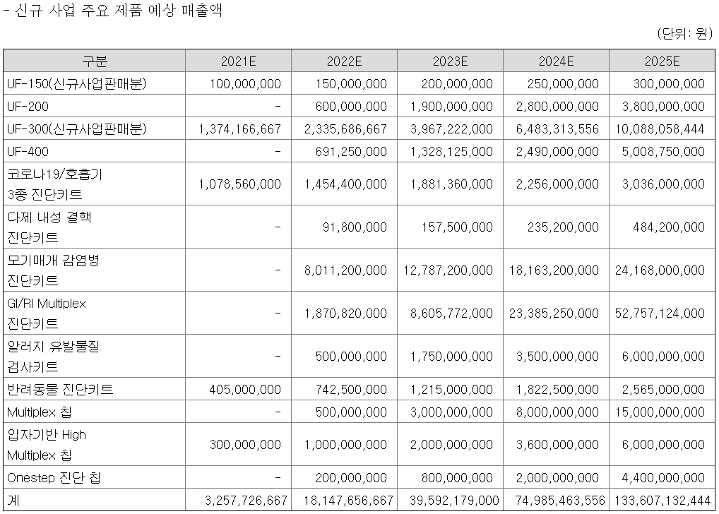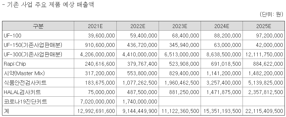 따라서 대부분의 이익 추정치를 미래에서 가져와야 한다. 기존 사업 주요 제품 예상 매출액으로 분자진단 시스템인 UF-300과 식품안전키트의 매출액을 높게 잡은 것을 확인할 수 있다. 여기까지는 기존 상용화된 제품이라고 치는데..