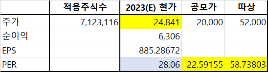 계산된 PER로 다시 주가를 계산해보니 24,831원이 나왔다. 주관사 산정과 크게 차이는 없다. 그래도 공모가 대비 24% 정도의 상승여력이 있는 것으로 해석할 수 있다. 공모가 기준 PER은 22.6배, 따상 시 PER은 58.7배 정도이다.
