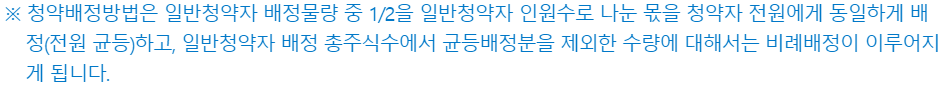 1/2을 일반청약자 인원수로 나눈 몫을 청약자 전원에게 동일하게 배정.