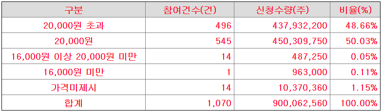 밴드 상단인 20,000원에 가장 많은 비율이 몰렸다. 밴드 중간 및 하단 미만에도 일부 신청건수가 있었다. 역시나 그렇게 좋은 결과라고 볼 수는 없을 듯.