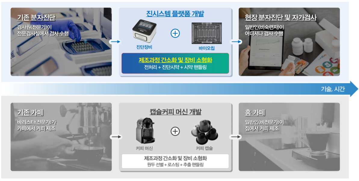기존의 실험실에서 상당히 오래 걸리던 분자진단 프로세스를 획기적으로 단축시킬 수 있다고 한다. 개인적으로는 이를 커피머신에 비유한 게 상당히 재미있었다.