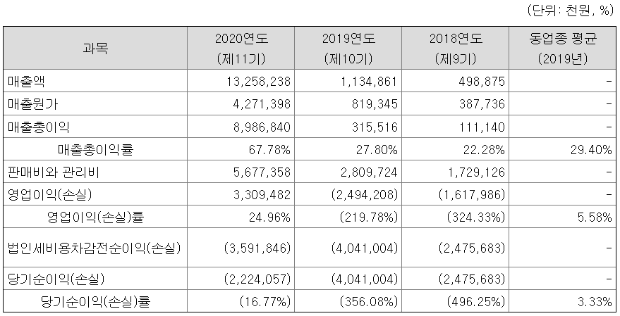 현재는 적자기업이다. 2020년 매출액이 상당히 늘고 그에 따라 영업이익이 흑자 전환하는 등, 가시적인 성과를 거두었다. 다만 이는 코로나19 진단키트로 인한 일시적 효과라고 봐야겠다.