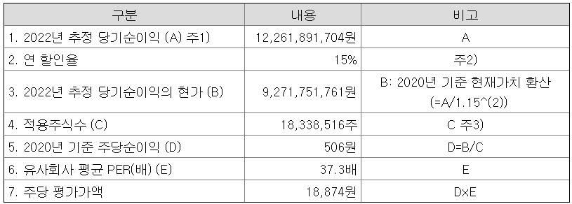 2023년 추정 당기순이익에 연 할인율 15%를 적용한 현가를 기준 당기순이익으로 잡았다. 유사기업 평균 PER 28.73배를 적용하면 주당 평가가액은 25,430원으로 계산되었다.