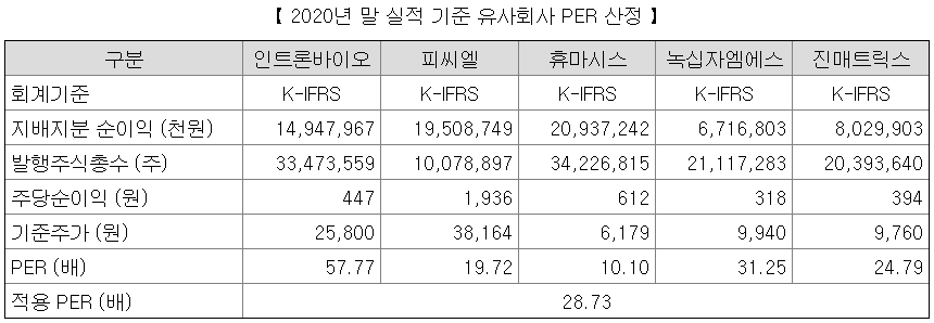 질병 진단, 예측 키트 제조 및 판매 또는 서비스를 주 사업으로 영위하는 기업들 중 재무적 요건을 만족하는 기업들로 뽑았다. 면역, 진단관련 기업들은 맞으나, 재무요건을 만족하는 회사들로 뽑다 보니 인트론바이오를 제외하고는 분자진단과는 좀 거리가 먼 회사들이다. 5개 회사의 평균 PER은 28.73배로 계산되었다.