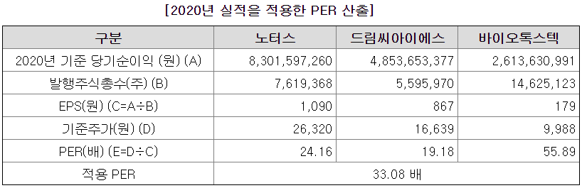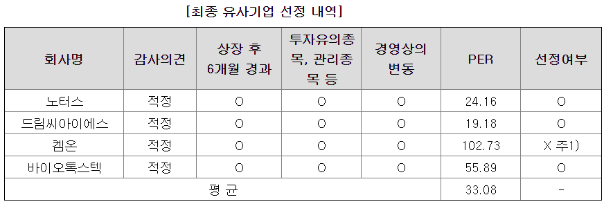 유사기업으로 노터스, 드림씨아이에스, 바이오톡스텍을 선정하였다.