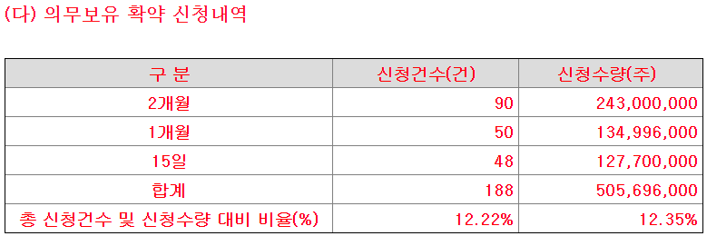 의무보유 확약 비율은 12.35%. 좀 애매하긴 한데, 중소형주 IPO치고는 꽤 괜찮은 비율이다. 다만 유의해서 봐야 할 것은 3개월, 6개월 의무보유확약이 없다는 점. 기관 입장에서 6개월 뒤에 팔아도 괜찮을 정도로 확신을 가질만한 기업은 아닌 듯?