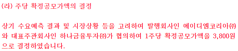 PER은 다소 고평가 된 것이 아닌가 싶었으나, 할인율을 아주 통 크게 적용하였다. 공모가 밴드 상단 기준 42.29%의 할인율을 적용하였는데, 확정 공모가가 3,800원으로 결정되면서 실제 할인율은 33.5% 정도로 결정되었다. 할인율이 10%나 떨어진 건 아쉽지만, 준수한 할인율이다.