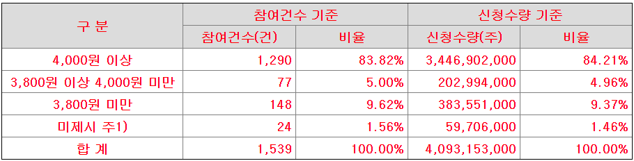 밴드 상단인 3,300원은 물론이고, 공모가로 제시된 3,800원 이상 신청 비율이 89% 이상이었다. 미제시를 포함하면 90%가 넘는 비율.