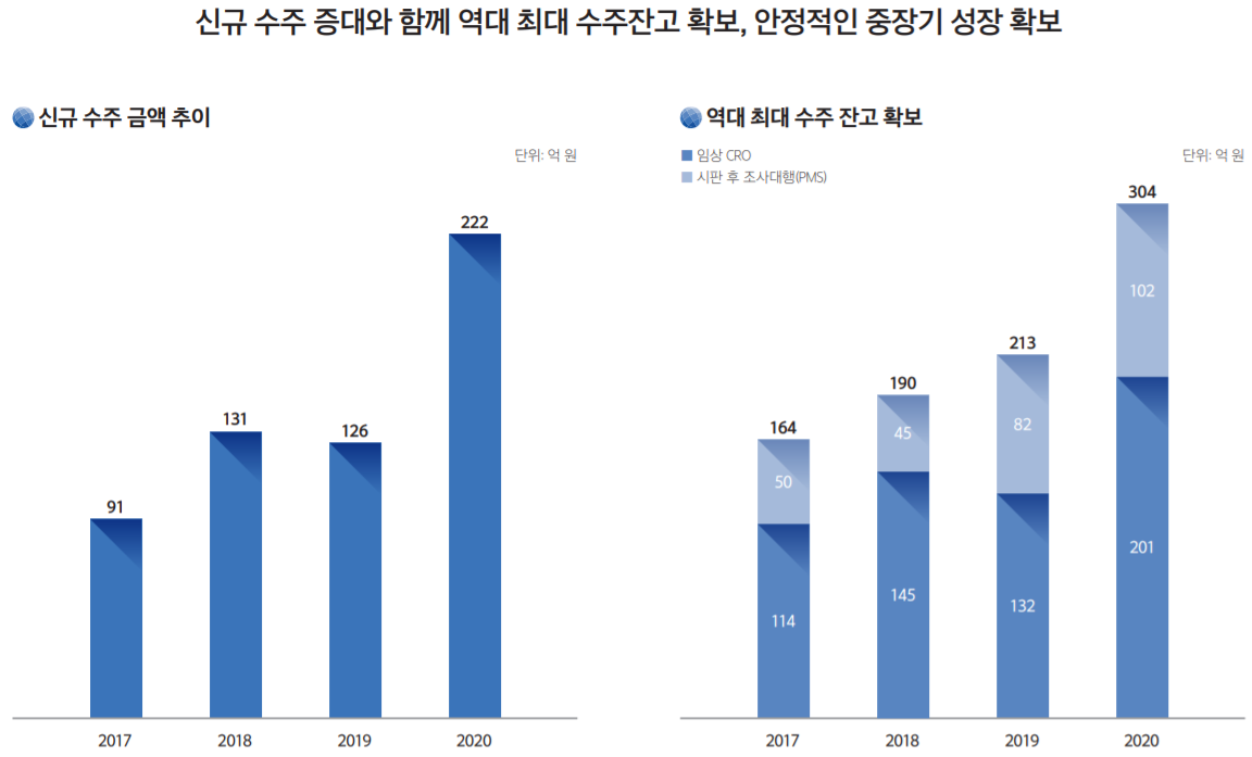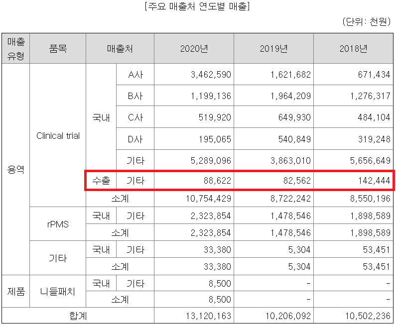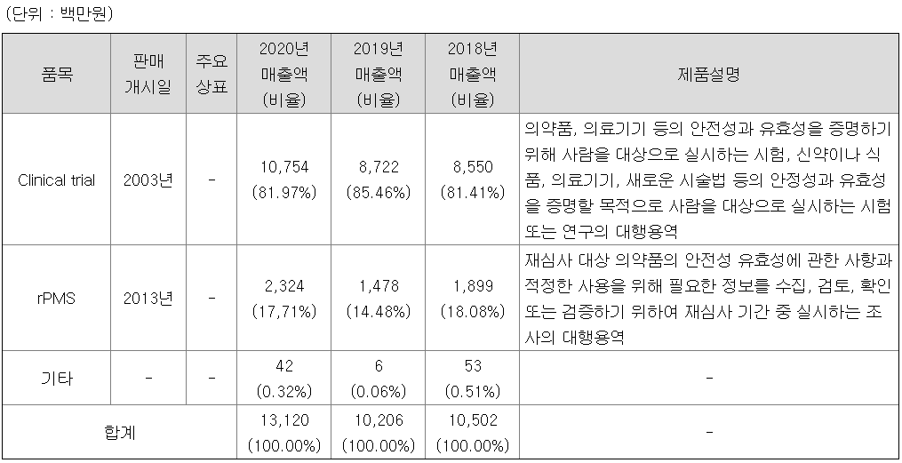 임상시험에 해당하는 Clinical trial에서 대부분의 매출액이 나오고 있다. 시판 후 조사에 해당하는 rPMS는 전채 매출의 18% 정도. 매출액은 2020년 기준 전년 대비 28% 이상 성장하였다.
