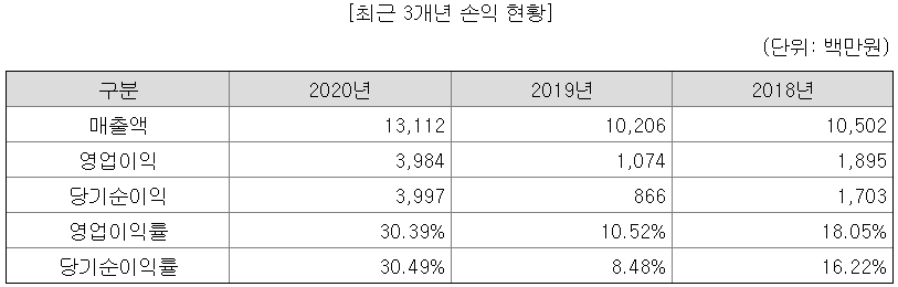2020년 기준 매출액 성장보다 놀라운 것은 급속도로 성장한 영업이익과 당기순이익이다. 영업이익률이 무려 30.39%이다. 2019년 영업이익이 감소했으나, 임차비용 및 외주용역비 등 비용 증가가 원인이다. 증가된 수주 상황에 대한 선제적 대응으로 인원을 증가시켰다고 한다. 물론 영업이익률이 가장 좋을 때 상장을 추진한 것도 있겠으나, 영업이익률 업종 평균이 4.59%이라고 하니 경쟁업체 대비 높은 비교우위를 가지고 있다고 할 수 있겠다.