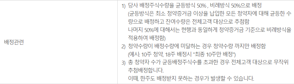 50% 균등배정, 50% 비례배정으로 비례배정 청약에 유리하다.