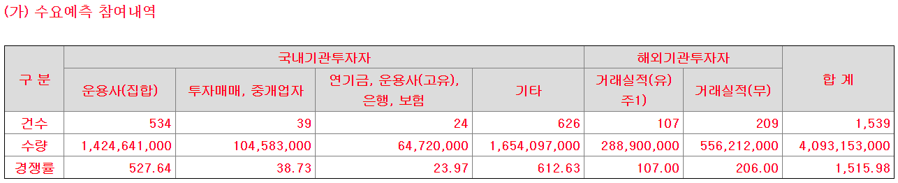기관 수요예측 결과 최종 경쟁률 1515.98을 기록하였다. 꽤 높은 수준. 최근 공모 청약 기업 중에서는 샘씨엔에스의 1537.67과 비슷하다.