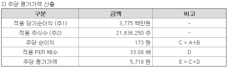 2020년 당기순이익을 그대로 적용하였다. 유사기업 평균 PER 33.08배를 적용하여 주당 평가가액은 5,718원이 나왔다.