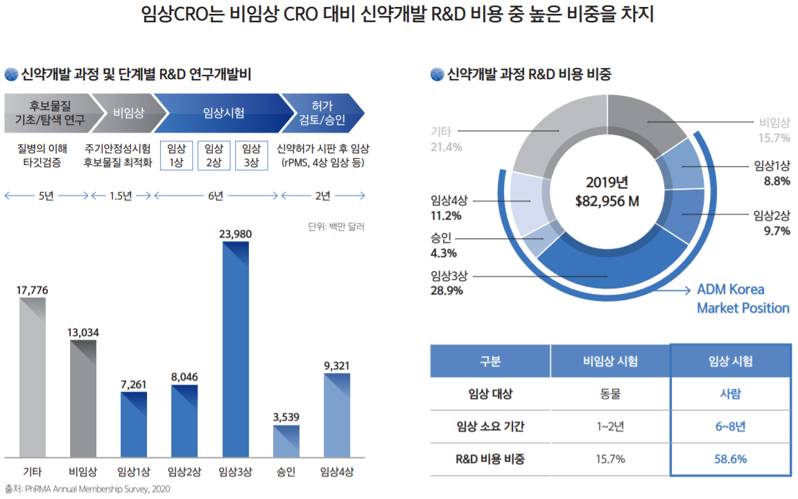 에이디엠코리아는 제약회사, 바이오벤처 등에 임상시험과 관련한 전 영역에 걸친 서비스를 제공하는 임상시험수탁기관(CRO: Contract Research Organization)이다. 신약의 시판을 위해서는 작게는 5년, 평균 10년간 단계별 임상시험을 수행해야 하는데, 이 과정에서 고객사로부터 임상 시험의 전체 또는 일부 업무를 위탁받아 수행하고 수수료를 받는 비지니스 구조이다.