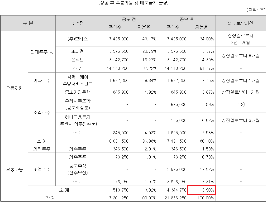 유통가능물량은 19.9%. 약 2.4%정도의 기존주주 물량을 제외하면 유통가능물량 대부분이 공모 물량이다. 공모가 기준 유통가능금액은 165억 수준. 상당히 가벼운 종목으로, 최근 상장한 삼영에스앤씨보다도 가볍다. 거기다 기관 의무보유 배정물량에 따라 좀 더 줄어들 여지가 있다. 행복회로를 조금 돌려 30% 정도만 의무 확약으로 묶여도, 유통가능물량은 16.2% 정도로 낮아진다.
