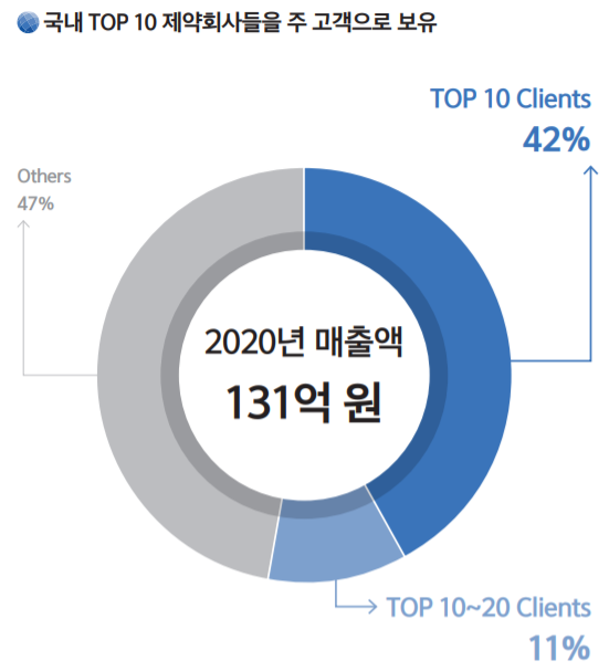 현재 국내 TOP 10에 해당하는(한미, 대웅, 보령, LG 등) 제약회사들을 주요 고객으로 보유 중이다.