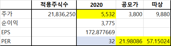 이를 바탕으로 계산한 적정주가는 5,532원이다. 내가 계산하고도 좀 찝찝하네.. 참고만 하고 넘어가자. 공모가 기준 PER은 22배, 따상 시 PER은 57배 정도이다.
